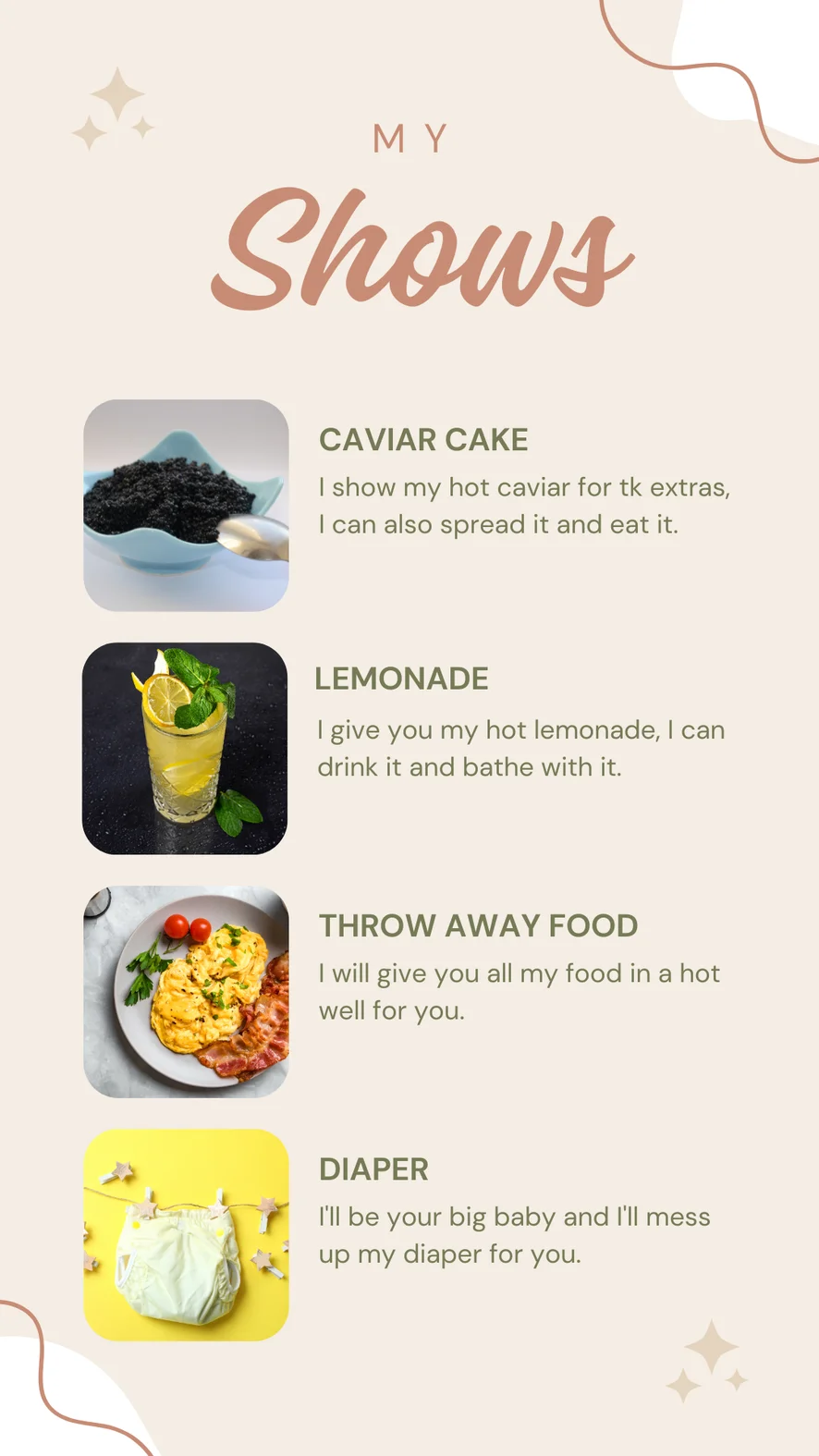 Догі-стайл, Ахеґао, Доміна, Спанкінг, Еротичні танці, Верблюжа лапка, Дилдо або вібратор, Брудні розмови, Оцінювання прутня, Йога, Тверкінг, Топлес, Підбори, Олійне шоу, Фут-джоб, Мастурбація рукою, Нейлон, Між грудьми, Масаж, Латекс, Іграшки для сосків, Рольові ігри, Приниження, Паління, Стриптиз, Мастурбація пальцями